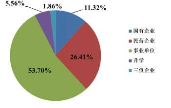 2023年硕士研究生毕业生共计53人,其中6人入职于公务员和事业单位,占比总人数的11.32%,14人就职于央企和和国企,占毕业生总人数的26.41%,29人就职于民营企业,占毕业生总人数53.70%,升学攻读博士学位3人,就职于三资企业1人,分别占比5.56%和1.86%。具体情况如下: