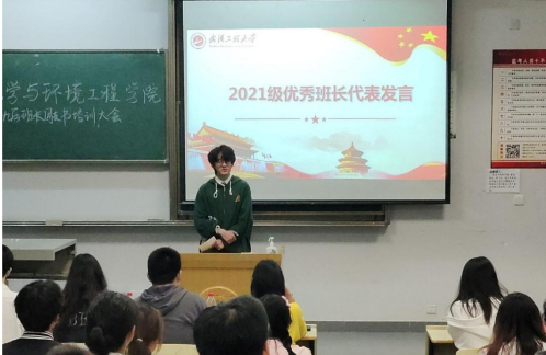 来自2020级环境工程02班的韩卓作为优秀班长向各位2022级的新生班长、团支书们传授经验。他认为“班长作为一班之长,需要一个有勇气、有毅力的人来担当”,担任了两年班长的他,从班级建设、班级沟通两个方面进行了他的经验讲述。