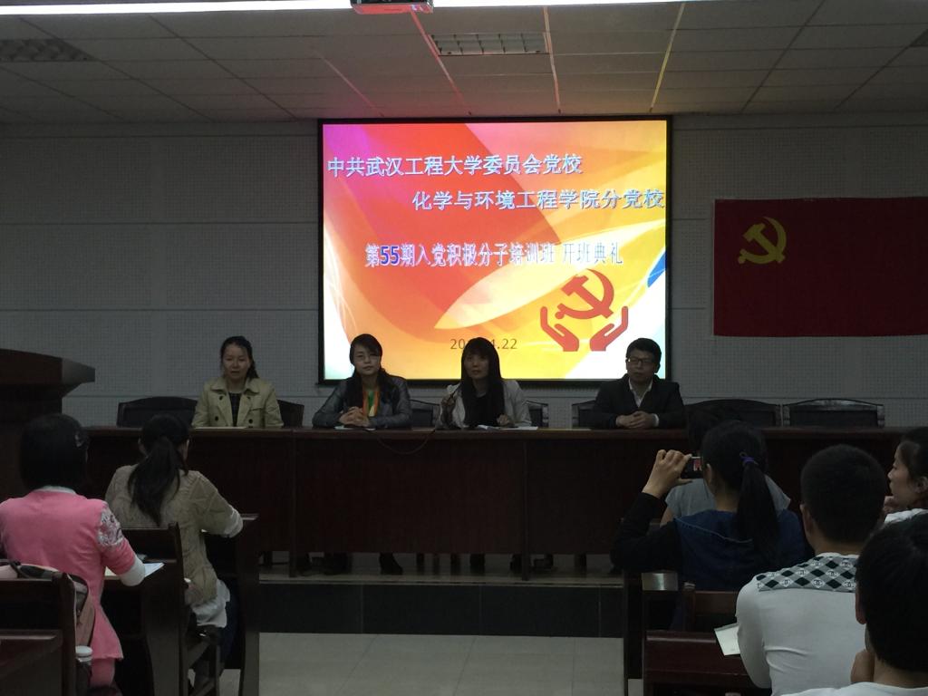 第55期入党积极分子培训班开班典礼在一实验楼101室举行。第55期入党积极分子培训班全体学员,学院党委书记、分党党校校长刘汉红,党委副书记、分党党校副校长徐迪迪,团委书记刘静老师和学生工作办公室主任李琪娜老师参加了开班典礼,典礼由本期培训班班主任陈云老师主持。