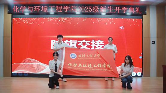 本研老生代表秦昌禹、孙明扬向新生代表陈萌萌、薛睿颖授予学院旗帜,象征着传承与责任。这一刻,标志着新生们将承载着学院的精神与文化,继续前行。