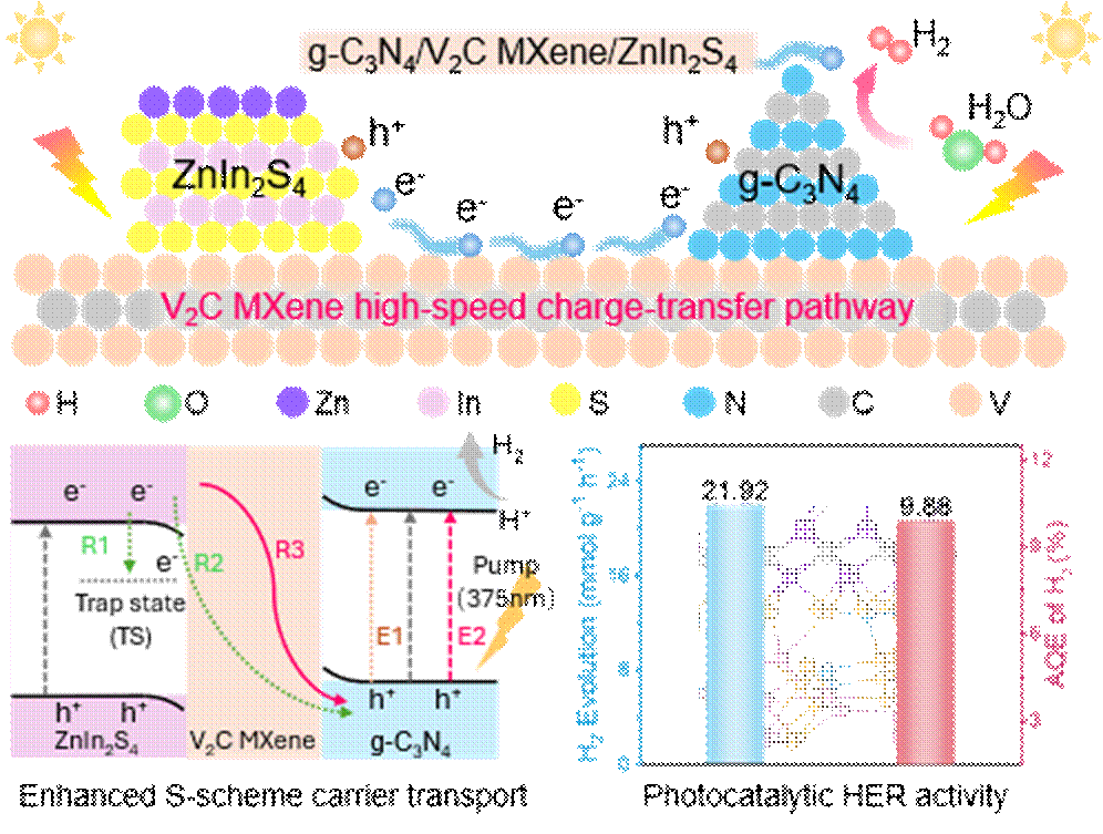 该研究通过巧妙的“MXene电荷桥+S型异质结”协同设计;利用具有金属级导电性的V₂C MXene构筑电子快速通道,重构界面电荷传输路径;在维持强还原能力的基础上,实现载流子的高速迁移与分离,大幅提升光催化制氢效率;结合理论与原位实验,明确揭示了MXene介导的电荷转移机制;为多元异质结光催化剂的精密界面设计提供了可推广的新范式。所得CN/V₂C/ZIS三元异质结展现出卓越的光解水制氢性能,其制氢速率高达21.92 mmol·g⁻¹·h⁻¹,优于已报道的诸多催化剂。本研究不仅明确了MXene在S型异质结中作为高效电子调节剂的关键角色,同时也为下一代高性能光催化剂的界面工程提供了具有普适性的设计策略。这一成果未来可拓展至CO₂还原、污染物降解等多种光催化体系,为推动光催化技术向高效、稳定、实用化方向发展奠定了重要的理论与实验基础。