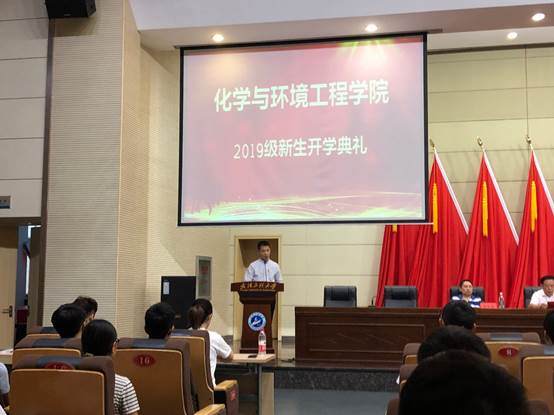 2019级新生开学典礼在四教多功能报告厅举行,学院党委副书记李正新、副院长董志兵、副院长余军霞、院长助理张华丽、工会主席陈伟、制药化学研究所所长陈云峰、环境化学研究所所长邱心泓、国家级环境与环工清洁生产实验教学示范中心副主任袁华、实验中心副主任郁先哲、学院学生工作办公室全体人员、新生班主任、教师代表和2019级全体本科和研究生新生参加开学典礼。典礼由学院党委副书记李正新主持。