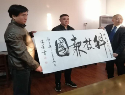 仪式上,叶芃理事长代表基金会接受了公司特邀著名书法家李海峰题写的作品“科技兴国”和“科技报国”字幅。同时,叶芃代表基金会向捐赠方颁发了捐赠证书和教育贡献奖奖杯,以此致谢企业支持学校教育事业发展的捐赠善举。
