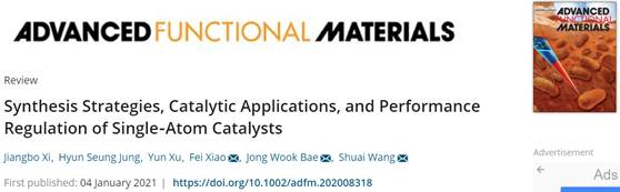 同月,奚江波老师与华中科技大学和成均馆大学(韩国)合作,1月4日在《AdvancedFunctional Materials》(一区,Top期刊)上在线发表了一篇题为《SynthesisStrategies, Catalytic Applications and Performance Regulation of Single-AtomCatalysts》(DOI: 10.1002/adfm.202008318)的综述。该文章综述了单原子催化剂(SACs)的合成策略、催化应用和性能调节等方面的最新研究进展。
