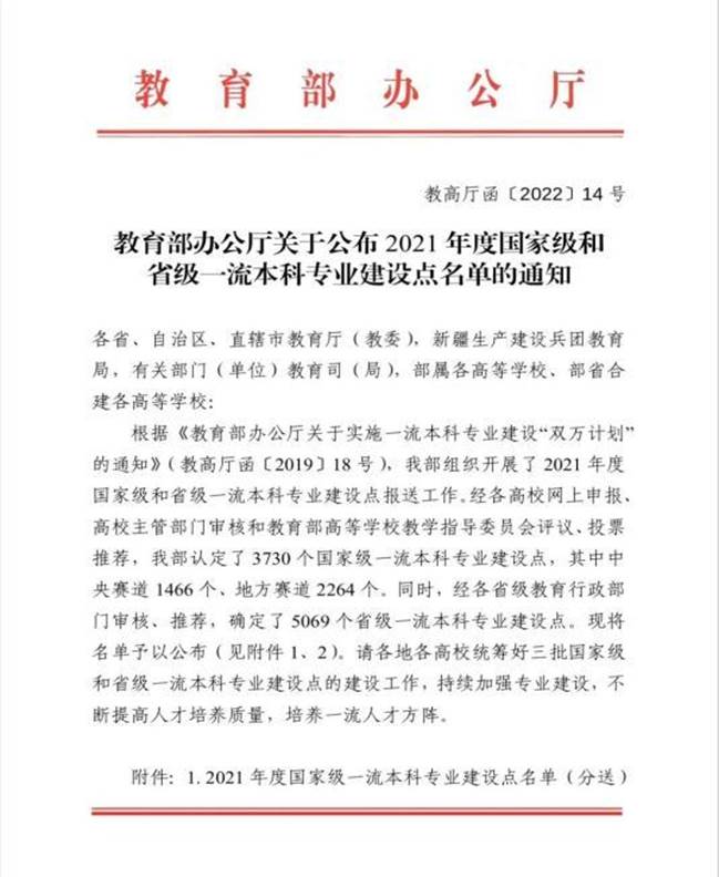 (通讯员 周旋)近日,教育部发布了《教育部办公厅关于公布2021年度国家级和省级一流本科专业建设点名单的通知》(教高厅函〔2022〕14号),蜜桃直播