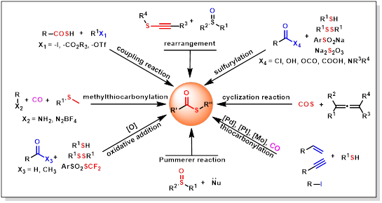 基于硫酯单元的重要合成意义,董志兵课题组近期就硫酯类化合物的合成方法和应用进展进行了综述。作者按照构筑方法的不同,从硫代羧酸的偶联反应、酰基化合物的硫酯化、醛类的氧化加成、烯烃/炔烃以及卤代芳烃的硫羰基化等合成路径探讨了硫酯类化合物的合成进展,重点介绍了这些方法的发展历程及局限,并对具有代表性的合成机理进行了描述。最后,作者对硫酯的合成策略、研究方向以及应用前景进行了展望。