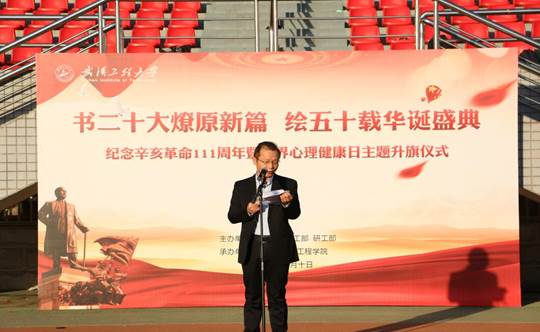 承办的“书党的、中共二十大燎原新篇,绘五十载华诞盛典”纪念辛亥革命111周年暨世界心理健康日主题升旗仪式在流芳校区田径场举行。党委学生工作部部长、学生工作处处长吕容涛、党委宣传部副部长赵小硕、党委研究生工作部副部长陈朝娟、院党委书记张宗良、院长余军霞、党委副书记许守飞、副院长董志兵、副院长张华丽、全院辅导员和学生代表加了本次升旗仪式。