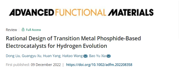 教师在国际权威期刊“Advanced Functional Materials”上发表综述论文。该论文系统地介绍了过渡金属磷化物电催化剂的合理设计及其在析氢反应中的应用,提出了该领域现存的挑战和未来可期的发展方向。相关成果以“Rational Design of Transition Metal Phosphide-Based Electrocatalysts for Hydrogen Evolution”为题在线发表,文章DOI号为10.1002/adfm.202208358。刘东副教授为论文第一作者,硕士生徐光宇为第二作者,蜜桃直播