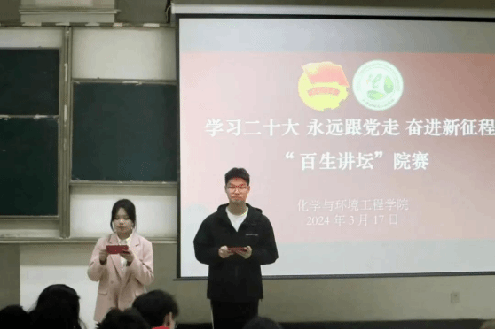 在L1119举行2024年“百生讲坛”院级系列赛事。本次活动由院团委老师李杨、团委副书记陈萌萌、主席团成员韩嘉宁、赵吉祥担任评委。各班参赛选手、各班级学生代表共计60余人参加本次活动。