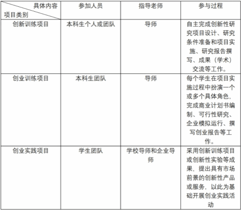 大创,全称为“大学生创新创业训练计划项目”,旨在通过实施国家级大学生创新创业训练计划,促进高等学校转变教育思想观念,改革人才培养模式,强化创新创业能力训练,增强高校学生的创新能力和在创新基础上的创业能力,培养适应创新型国家建设需要的高水平创新人才。大创包括创新训练项目、创业训练项目和创业实践项目三类(详见下表),分为国家级和省级二个级别,每年5月份进行一次申报立项工作,全校国家级25项,省级75项,经费分别为5000元和3000元。大一、大二、大三的学生可以通过组建团队,论证自己的方案,设计研究目标,申报大创项目。在获得资助后,可以在专业学习之余,运用自己所学的专业知识,开展相关研究和创业项目,提升自己的专业能力,项目结题需要项目第一负责人以第一作者发表论文或者作为负责人参加A类赛事并获得高档次奖项。