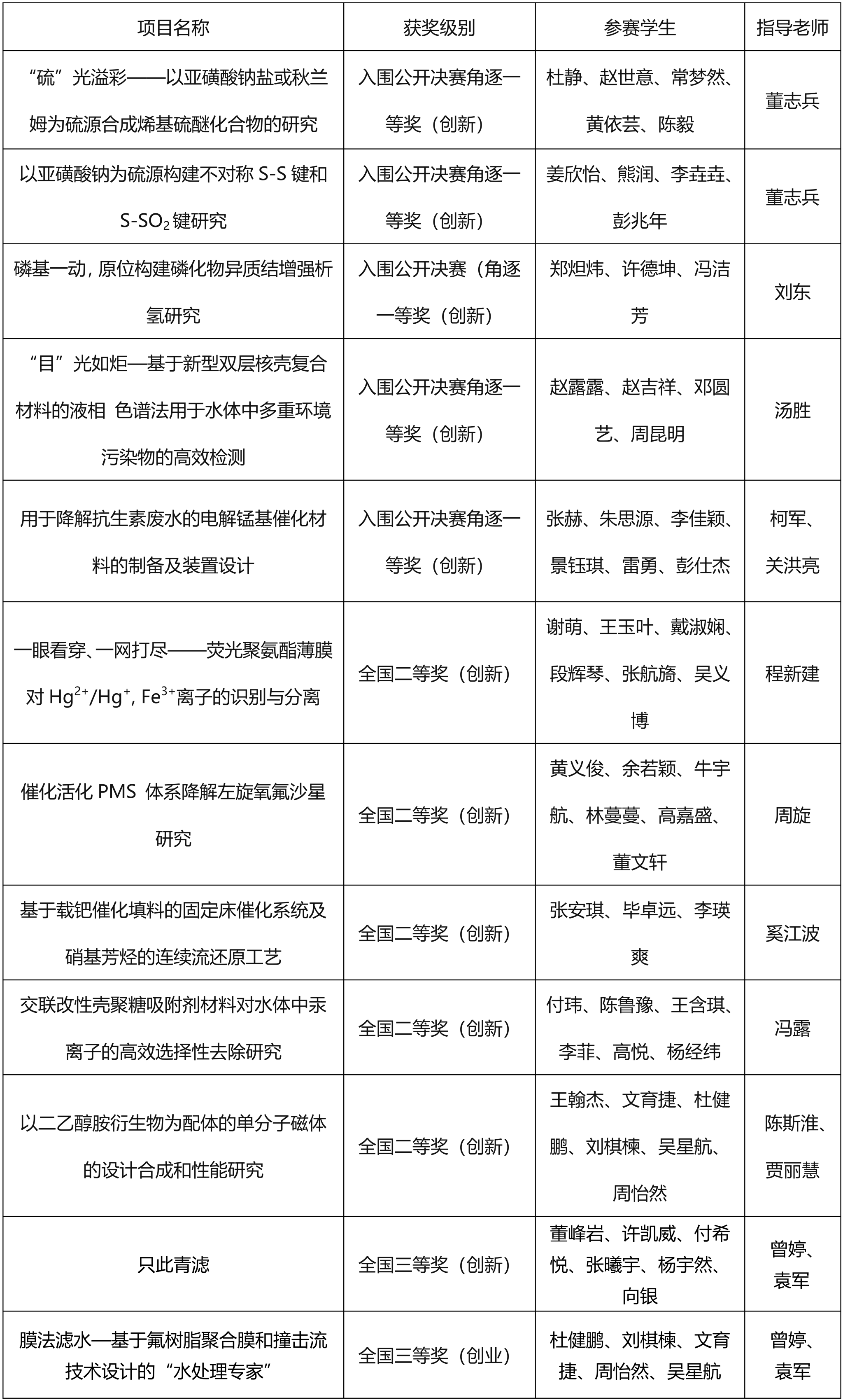 近年来,学院高度重视本科生双创教育工作,在“互联网+”创业大赛、挑战杯、节能减排大赛、化学实验创新设计大赛等重要赛事上均取得了良好的成绩。学院将持续把竞赛作为双创教育的重要抓手,进一步完善创新型人才培养体系,更好地助力学校一流学科建设。(审稿 张宗良 许守飞)