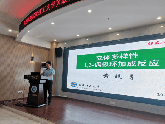 黄教授以《立体多样性1,3-偶极环加成反应》为题,首先介绍了课题组在1,3-丁二烯的制备和三价膦催化缺电子联烯的环加成两方面所取得的进展,并提出了相关具有挑战性的研究问题。随后,黄教授详细介绍了烷基硝酮的1,3-环加成反应、叶立德构建氮杂环反应和探索偶极环加成的反应历程三个方面的成果。黄教授以实验探索、底物拓展、机理研究的顺序介绍了他的工作,同时提出当前领域依旧存在的挑战。同时,黄教授详细地解答了在场师生的提问,并对其课题组提出的方法学在合成领域的应用进行了展望。