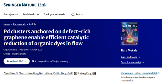 2022级应用化学专业本科生毕卓远(第一作者)在Springer Nature出版集团旗下期刊Rare Metals上发表了题为《Pd clusters anchored on defect-rich graphene enable efficient catalytic reduction of organic dyes in flow》的研究论文。据悉,Rare Metals为材料领域的中科院SCI一区、中国科技期刊卓越行动计划二期英文领军期刊,最新影响因子为9.6。