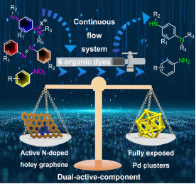 本文通过缺陷工程策略创制了一种在富缺陷氮掺杂石墨烯(NHG)-硅酸铝纤维(ASFs)共组装体上锚定钯团簇(PdC)的催化模块(PdC/NHG-ASFs)。得到的PdC/NHG-ASFs复合催化剂具有双活性组分(如,NHG和PdC),可以便捷地整合至玻璃柱管中得到稳定的多级多孔结构,构建一套高效的固定床连续流催化系统,并在六种含氮有机染料的还原反应中展现出较高的处理能力和优异的耐久性。在典型染料4-硝基苯酚的催化还原反应中,基于PdC/NHG-ASFs催化模块的固定床催化系统处理率可达1.45×10−3 mmol·mg−1·min−1,催化性能为同等条件下5%商业钯碳最大处理率的3.2倍,且优于已报道的基于其他诸多金属催化剂的流动催化体系。理论计算结果表明,双活性组分的协同效应可增强其在硝基芳烃还原反应中的催化性能。将非均相催化和流动化学技术整合起来可为实现高效、规模化和可持续的环境催化提供合理的设计理念。