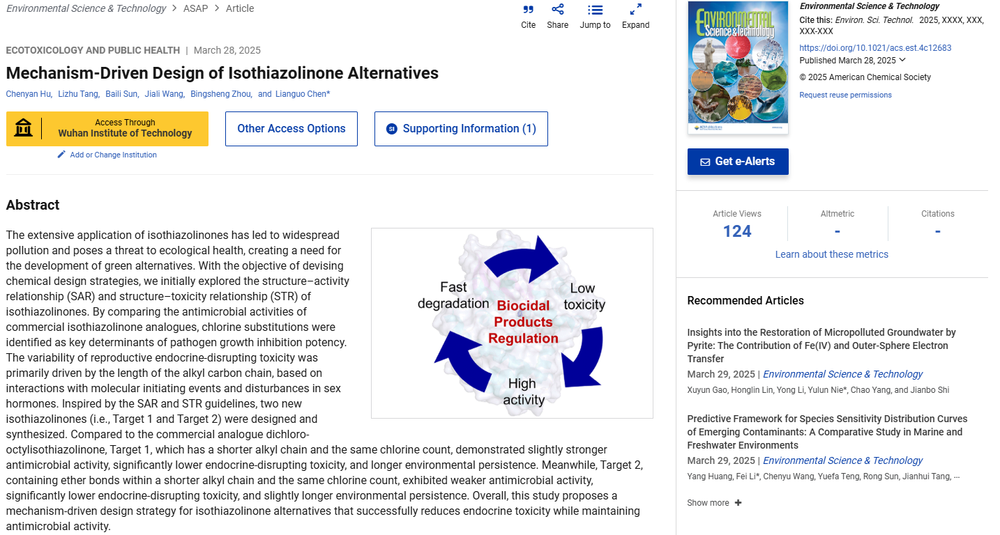蜜桃直播 教师胡陈艳在Environmental Science & Technology期刊上发表论文 作者:发布时间:2025-04-17点击率: (通讯员 胡陈艳)2025年3月28日环境科学与工程领域顶级期刊Environmental Science & Technology(ES&T)在线发表蜜桃直播 胡陈艳老师为第一作者(蜜桃直播 为第一单位)的研究论文“Mechanism-Driven Design of Isothiazolinone Alternatives”。异噻唑啉酮是一类高效广谱抗菌剂,广泛应用于护理产品、家庭用品和建筑船舶涂层。然而,其生产使用已造成广泛环境污染,干扰生殖内分泌功能,严重威胁生态健康,成为亟需关注和治理的新污染物。因此,开发高效低毒的绿色替代品迫在眉睫。本研究选取6种代表性异噻唑啉酮类似物,系统评估和比较其抗菌活性、胚胎急性毒性、Gαi靶蛋白亲和能力、以及内分泌干扰毒性,明确了决定抗菌活性与内分泌干扰毒性的关键结构元件。基于结构-活性关系(SAR)与结构-毒性关系(STR),采用机制驱动的设计策略,提出异噻唑啉酮替代品的合成路线:(1)保留氯取代和异噻唑啉酮环以保持有效的抗菌活性;(2)去除芳香环以避免引入内分泌干扰毒性;(3)缩短烷基碳链或引入醚键以降低疏水性和内分泌干扰毒性,成功合成两种新型异噻唑啉酮替代品(Target 1、Target 2),并对其抗菌活性、内分泌干扰毒性及环境降解动力学进行了全面评估。与具有C8烷基链和两个氯原子的商业化DCOIT相比,Target 1(C4烷基链、两个氯原子)展现出略高的抗菌活性、显著更低的雌激素毒性、以及更慢的降解速率;而Target 2(含有醚键的较短烷基链、两个氯原子)则表现出较弱的抗菌活性、显著更低的雌激素毒性,并且降解速度略慢。考虑到在保持抗菌性能的同时降低生态风险的综合需求,Target 1和Target 2均展现出作为各类产品中新型防腐剂的应用潜力。综上所述,本研究基于异噻唑啉酮的SAR和STR,采用机制驱动的设计策略,成功获得两种生态友好的新型异噻唑啉酮替代品,这一成果不仅可有效满足工业生产需求,还为未来绿色低毒化学品的设计提供了新的思路。ES&T杂志是美国化学学会的旗舰期刊,为中科院环境大类一区和JCR一区期刊,当前影响因子为10.9。这一研究主要由胡陈艳老师与中国科学院水生生物研究所陈联国研究员(论文通讯作者)合作完成,链接为://pubs.acs.org/doi/10.1021/acs.est.4c12683。 (审稿 张华丽)