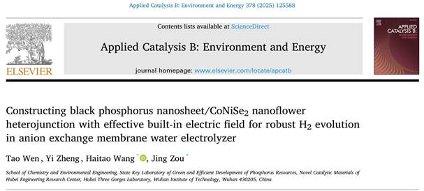 “催化与固废协同创新团队”在催化和能源领域国际权威期刊《Applied Catalysis B: Environment and Energy》(影响因子:20.3,中科院一区TOP,DOI:10.1016/j.apcatb.2025.125588)在线发表了题为“Constructing black phosphorus nanosheet/CoNiSe2 nanoflower heterojunction with effective built-in electric field for robust H2 evolution in anion exchange membrane water electrolyzer”研究论文。蜜桃直播