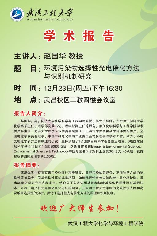 报告人简介:赵国华,男,同济大学化学科学与工程学院教授、博士生导师。先后担任同济大学化学系系主任、理学部党委书记、理学部副主任等职务,兼任化学科学与工程学院学术委员会主任、同济大学理学专业委员会副主任、上海市学位委员会学科评委组委员、全国电化学委员会理事、中国有机电化学与工业委员会常务理事等学术工作。致力于环境光电化学新方法和原理的研究,主持承担了1项国家自然科学基金重点项目,6项国家自然科学基金项目和1项国家863项目。以通讯作者在Energy & Environmental Science、Environmental Science & Technology等国际著名学术期刊上发表SCI论文140余篇,获得授权的国家发明专利近30项。