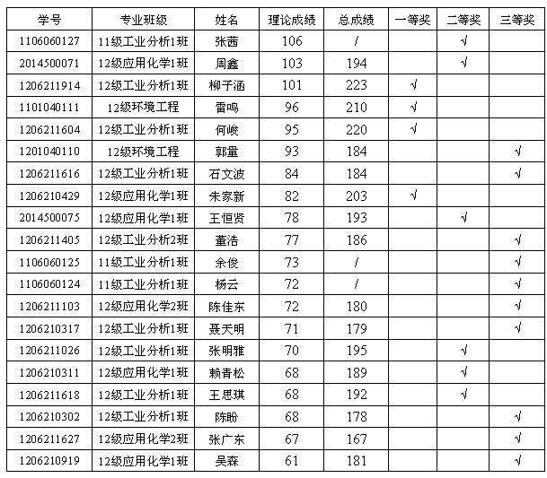 实验中心举行化学实验知识与技能竞赛 作者:发布时间:2015-05-07点击率: 为配合蜜桃直播 本学期学术活动周本科生科技创新和课外实践活动的开展,实验中心组织无机化学实验、有机化学实验、物理化学实验、分析化学实验的责任教师进行了以化学实验基本理论、基础知识和基本技能“三基”为主要内容的化学实验知识与技能竞赛活动。本次竞赛同时也是蜜桃直播 参加第五届湖北省大学生化学实验技能竞赛(专业队)选手的选拔赛。 学院共有45名学生自由报名参加了本次实验竞赛。竞赛由实验基本理论和基础知识笔试与化学实验技能现场操作两个部分组成,经各实验课程主讲教师和实验员评卷和现场评分,根据总成绩排名,以下20名同学分别获得本次竞赛的一、二、三等奖: